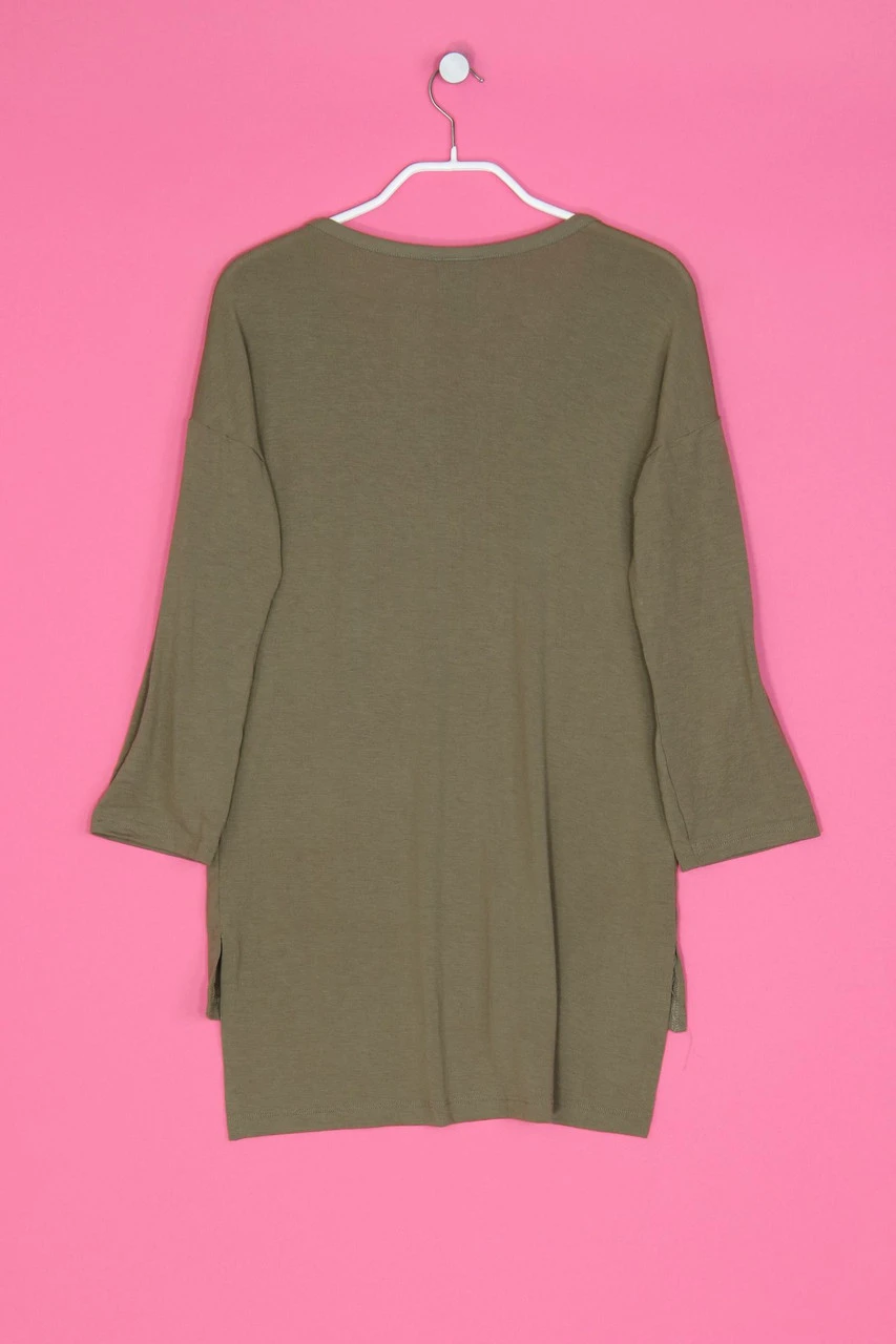 3/4-Arm-Shirt mit überschnittener Schulter, Camouflage im Vorderteil und seitlichen Schlitzen